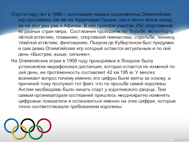 Спустя пару лет в 1896 г. состязания первых современных Олимпийских игр