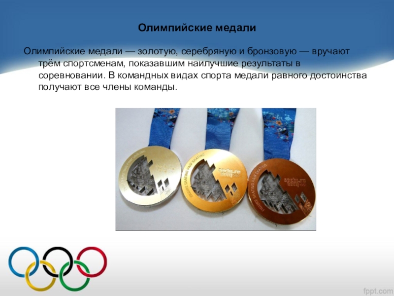 Олимпийские медали — золотую, серебряную и бронзовую — вручают трём спортсменам, показавшим