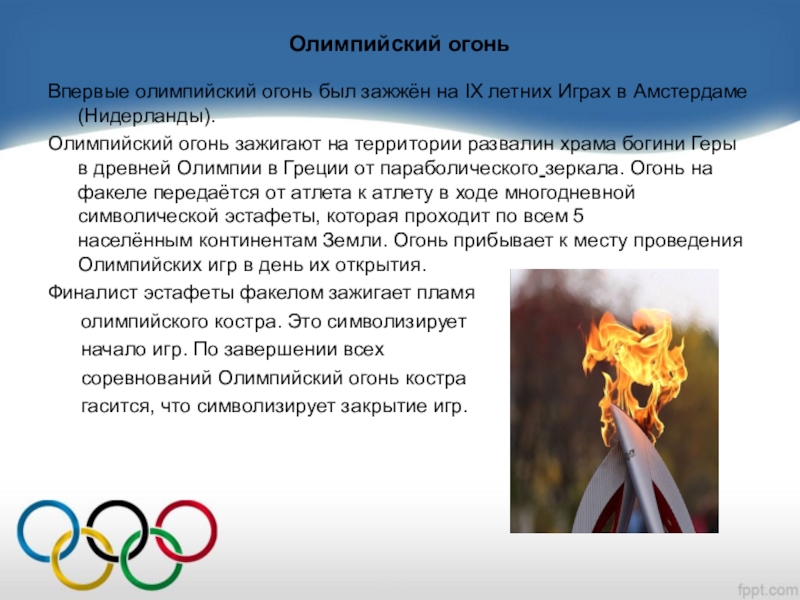 Впервые олимпийский oгонь был зажжён на IX летних Играх в