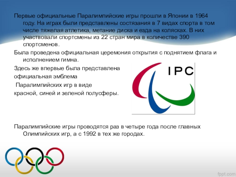 Первые официальные Паралимпийские игры прошли в Японии в 1964 году. На играх
