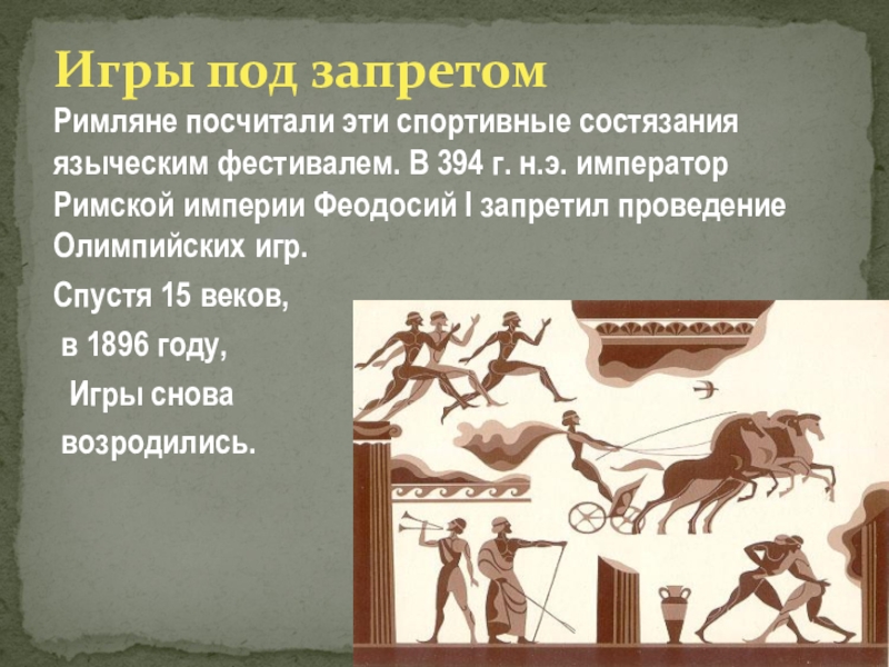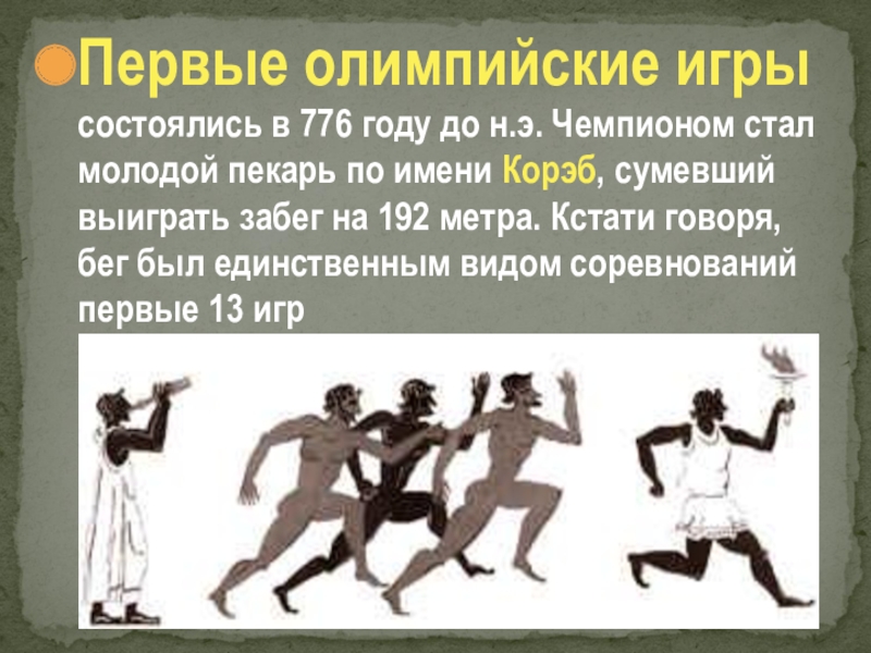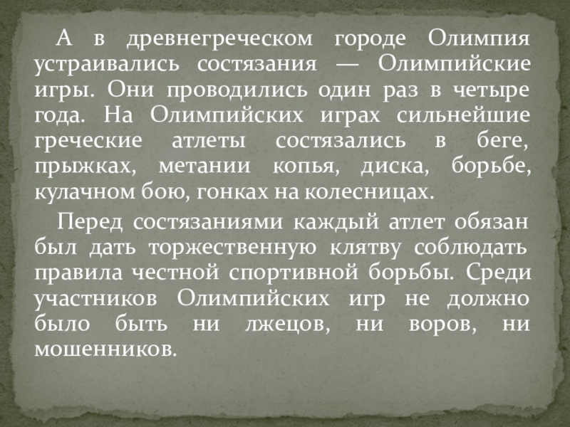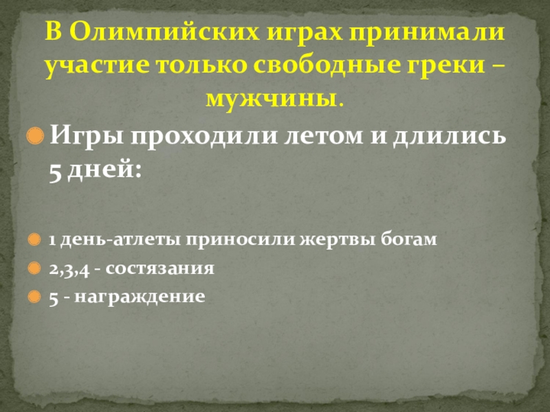 В Олимпийских играх принимали участие только свободные греки – мужчины.