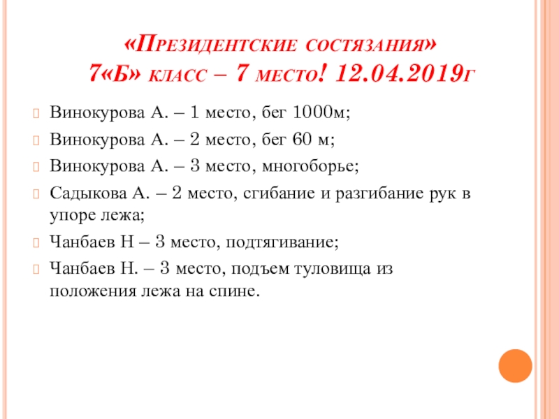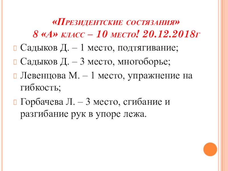 Садыкова А. – 2 место, сгибание и разгибание рук в упоре лежа;
