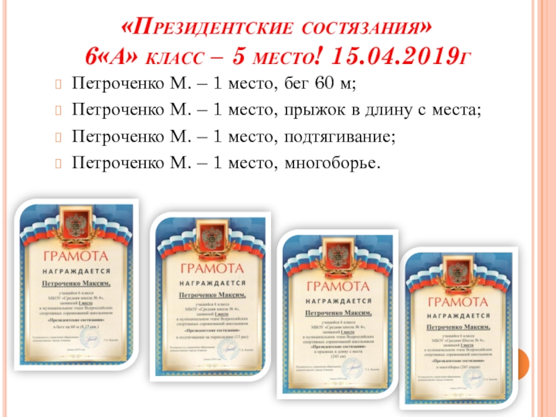Петроченко М. – 1 место, прыжок в длину с разбега;