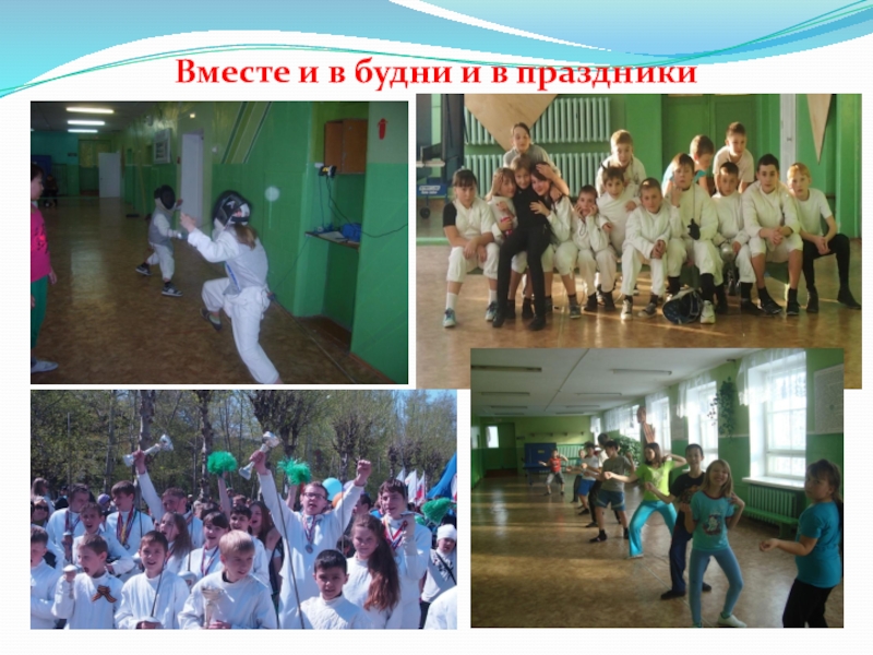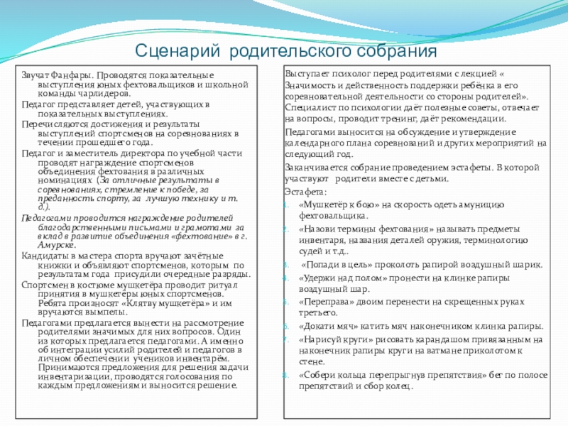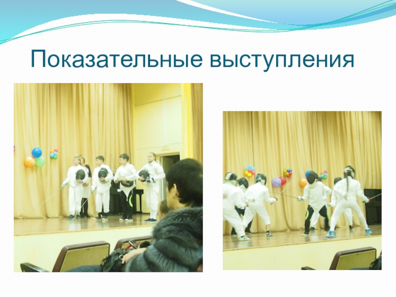 Звучат Фанфары. Проводятся показательные выступления юных фехтовальщиков и школьной команды чарлидеров.