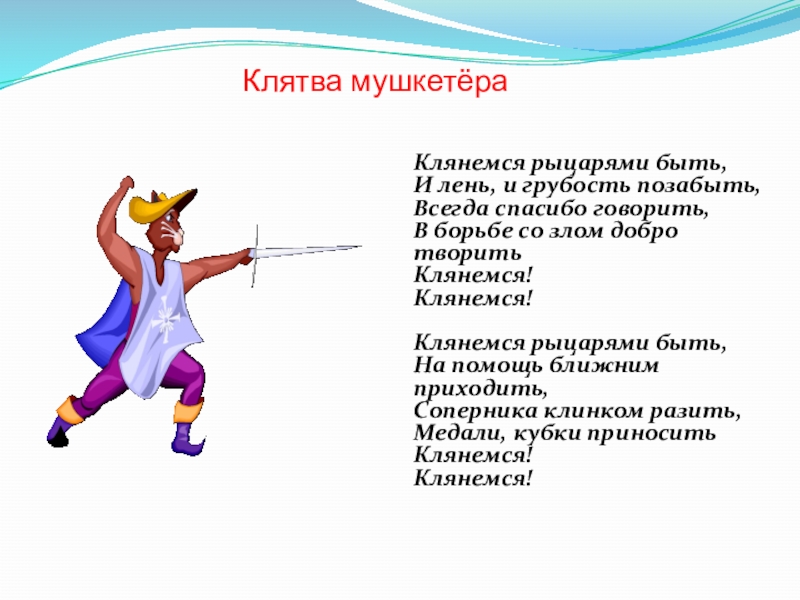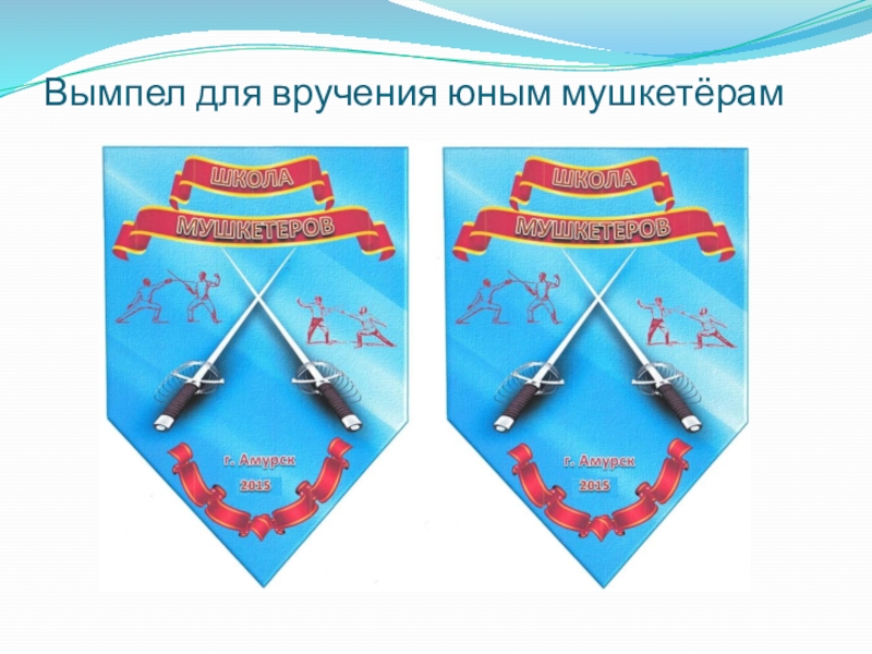 Спортсмен в костюме мушкетёра проводит ритуал принятия в мушкетёры юных спортсменов. Ребята произносят «Клятву мушкетёра» и им вручаются вымпелы.