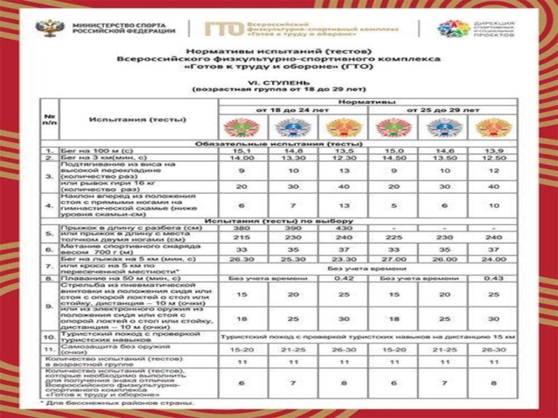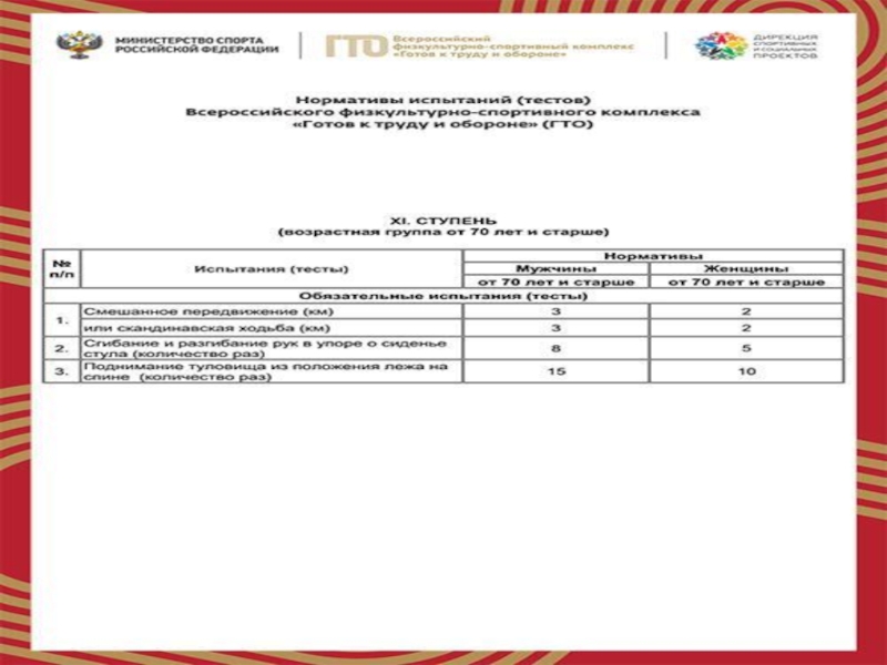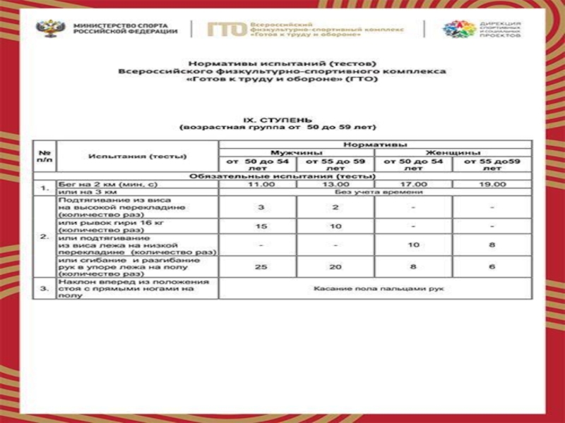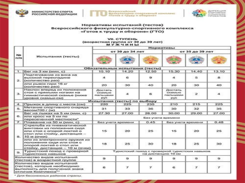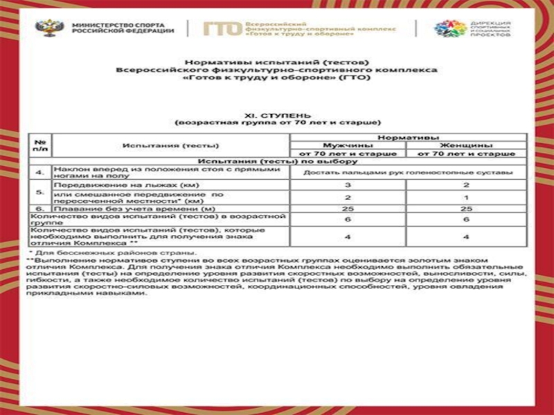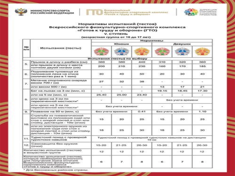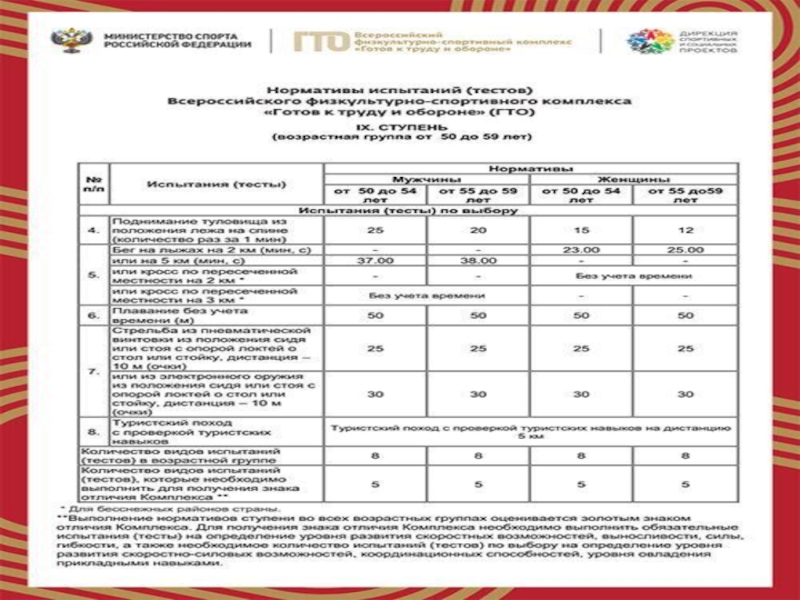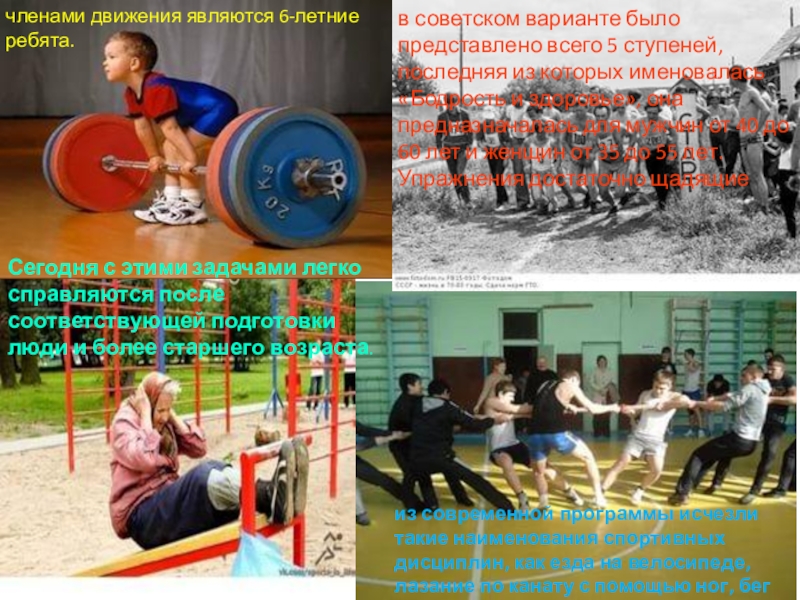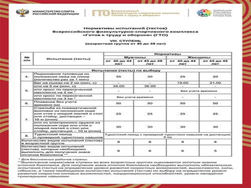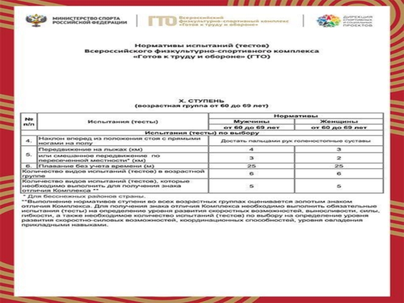 в советском варианте было представлено всего 5 ступеней, последняя из которых именовалась «Бодрость и здоровье», она предназначалась для мужчин от 40 до 60 лет и женщин от 35 до 55 лет. Упражнения достаточно щадящие