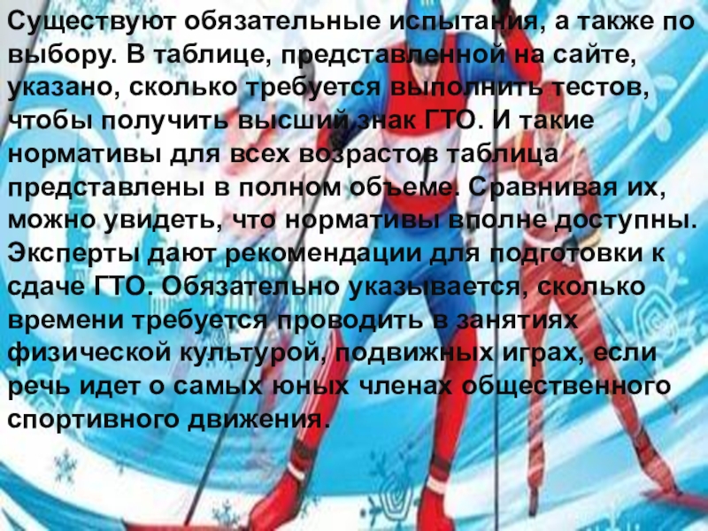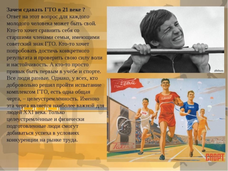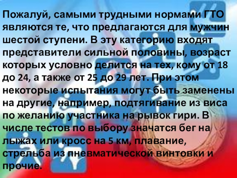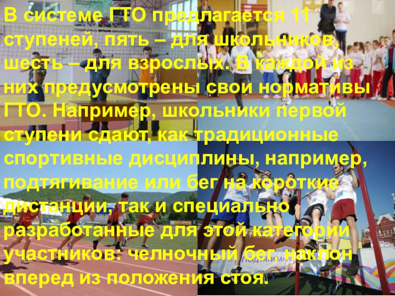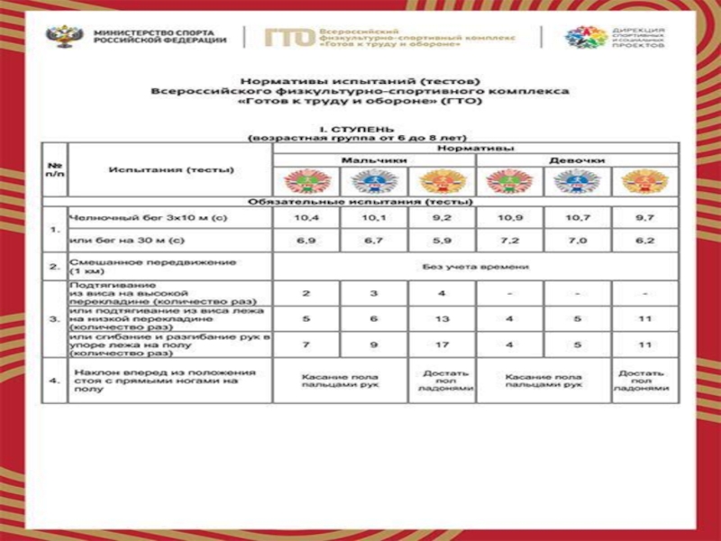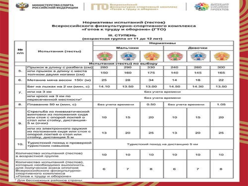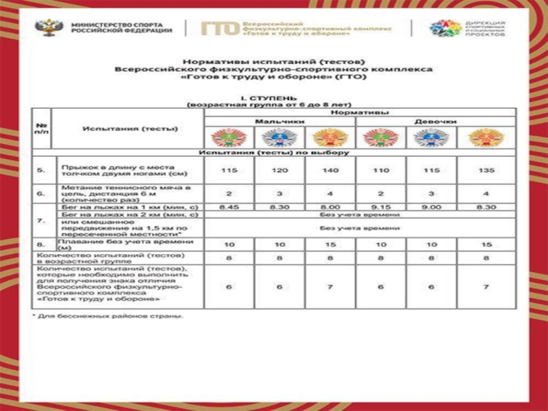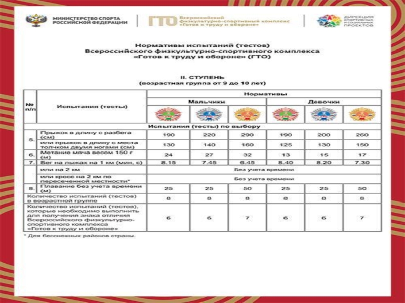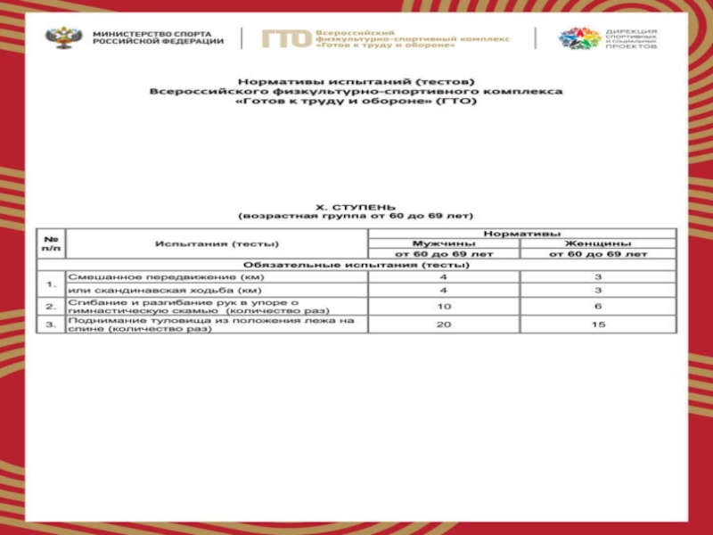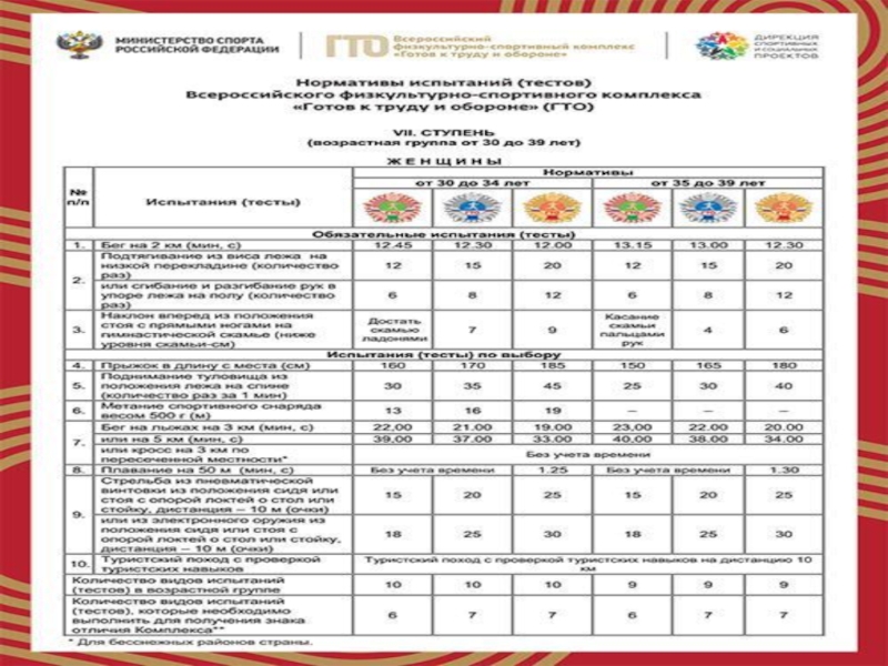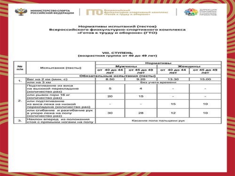 в советском варианте было представлено всего 5 ступеней, последняя из которых именовалась «Бодрость и здоровье», она предназначалась для мужчин от 40 до 60 лет и женщин от 35 до 55 лет. Упражнения достаточно щадящие