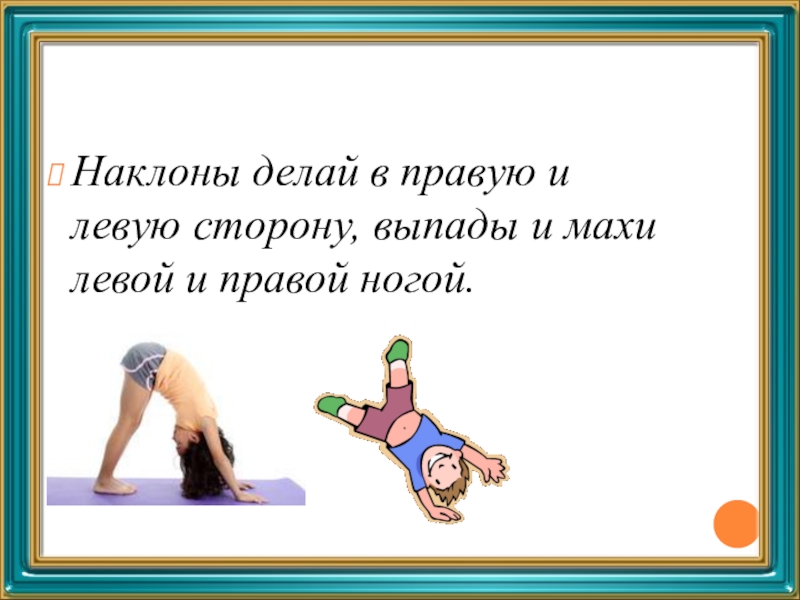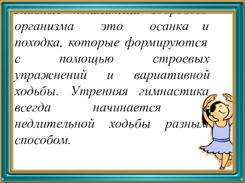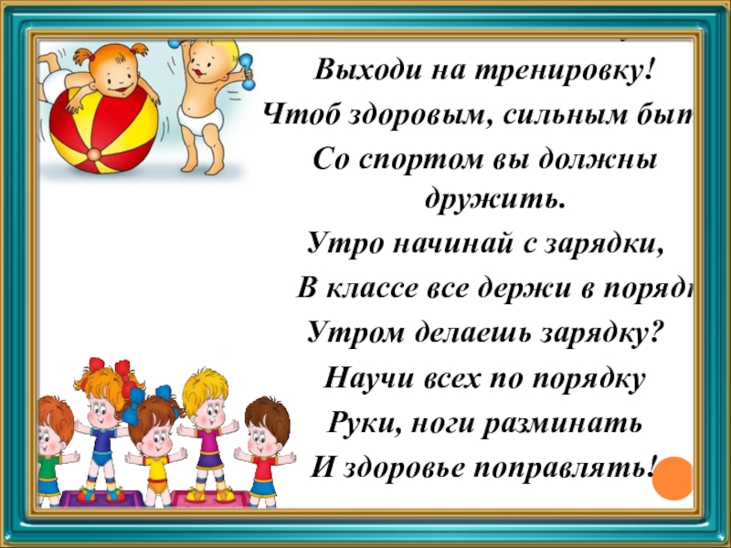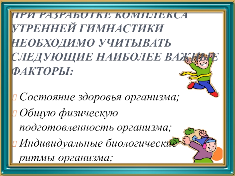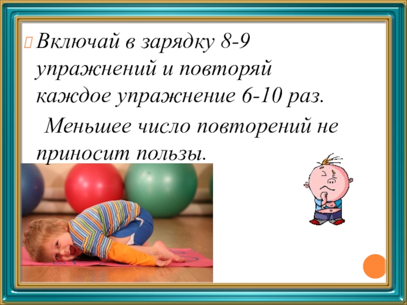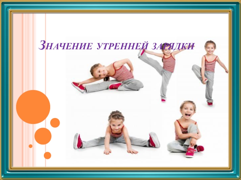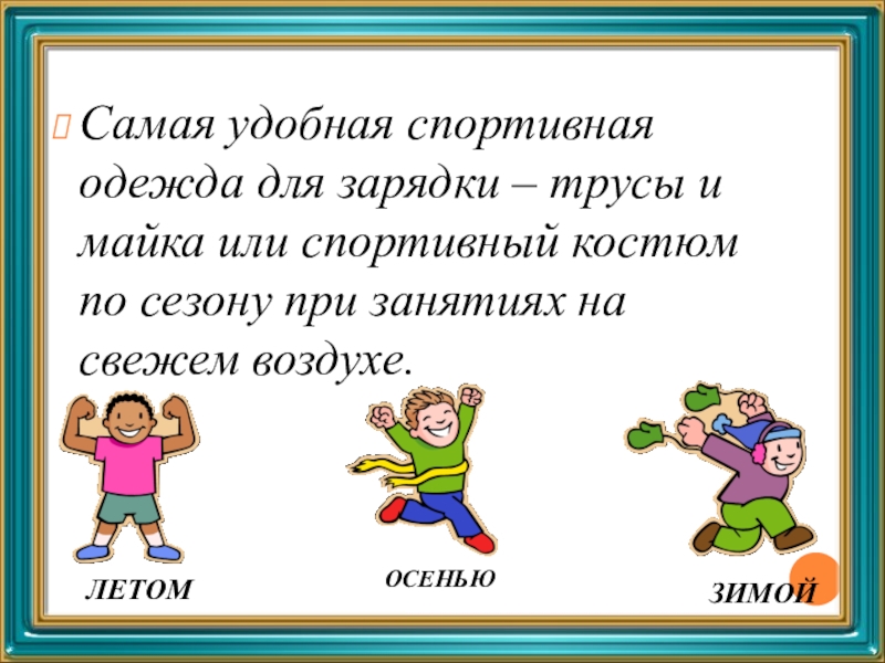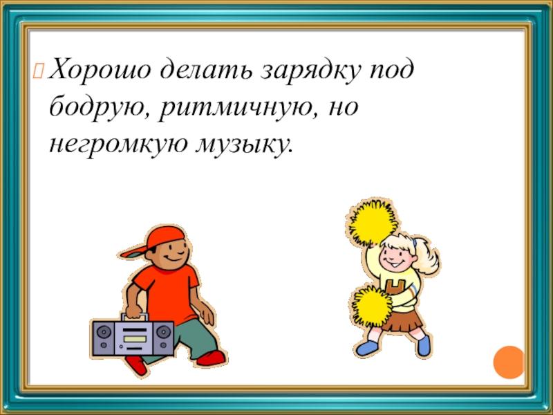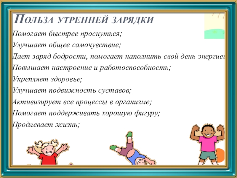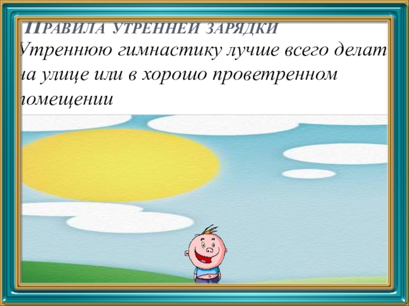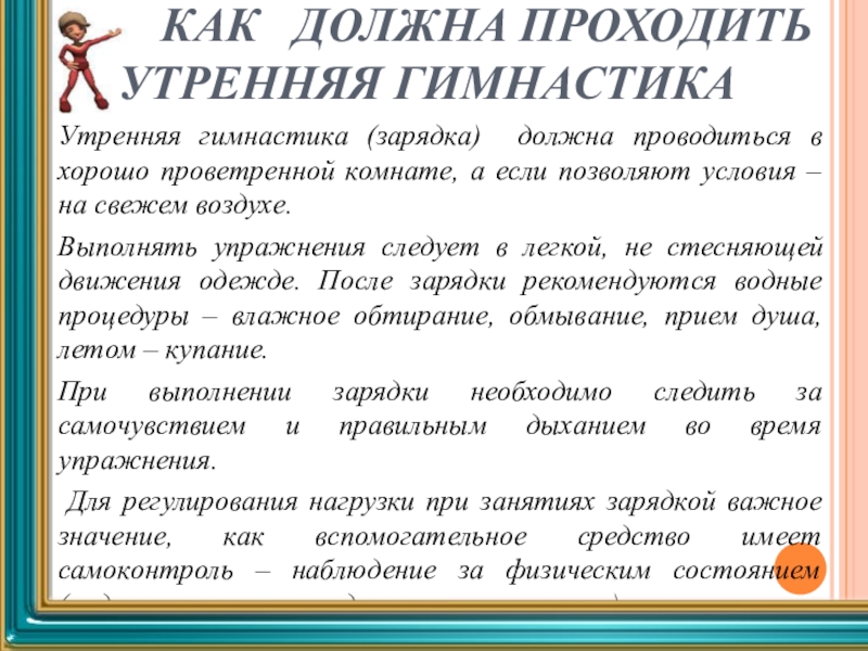 Утренняя гимнастика (зарядка) должна проводиться в хорошо проветренной комнате, а если позволяют условия – на свежем воздухе.