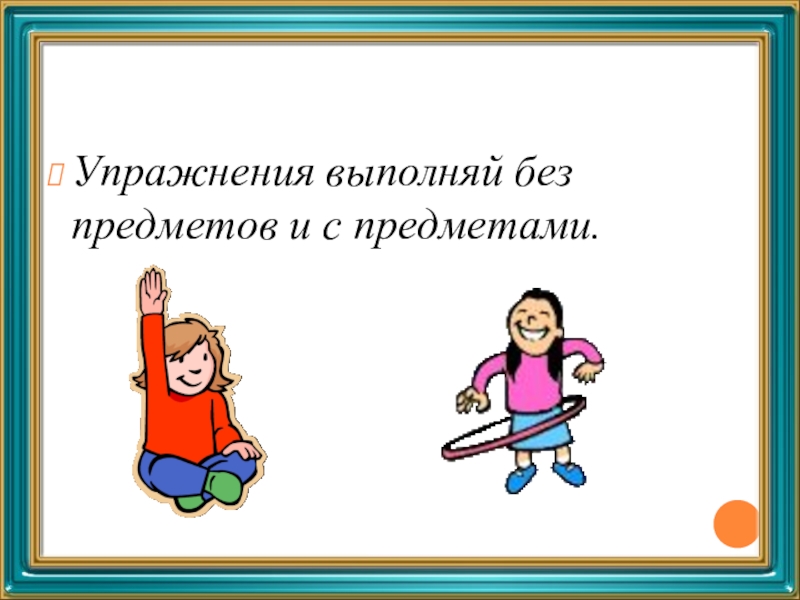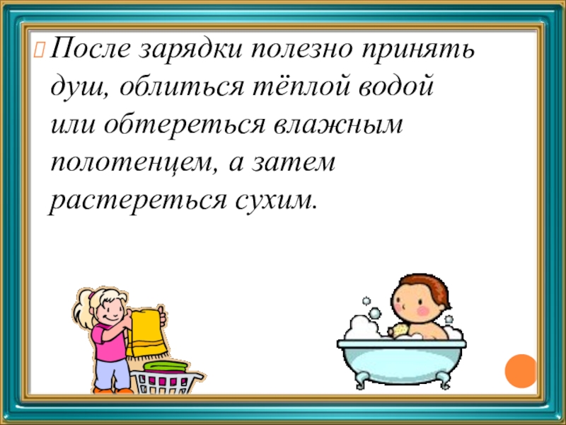 Выполнять упражнения следует в легкой, не стесняющей движения одежде. После зарядки рекомендуются водные процедуры – влажное обтирание, обмывание, прием душа, летом – купание.