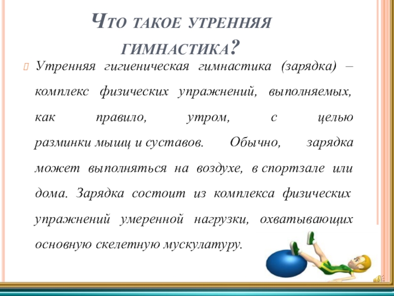 Утренняя гигиеническая гимнастика (зарядка) –комплекс физических упражнений, выполняемых, как правило, утром, с целью разминки мышц и суставов. Обычно, зарядка может выполняться на воздухе, в спортзале или дома. Зарядка состоит из комплекса физических упражнений умеренной нагрузки, охватывающих основную скелетную мускулатуру.