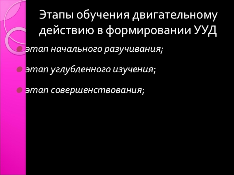 Этапы обучения двигательному действию в формировании УУД этап начального разучивания;этап углубленного изучения;этап совершенствования;