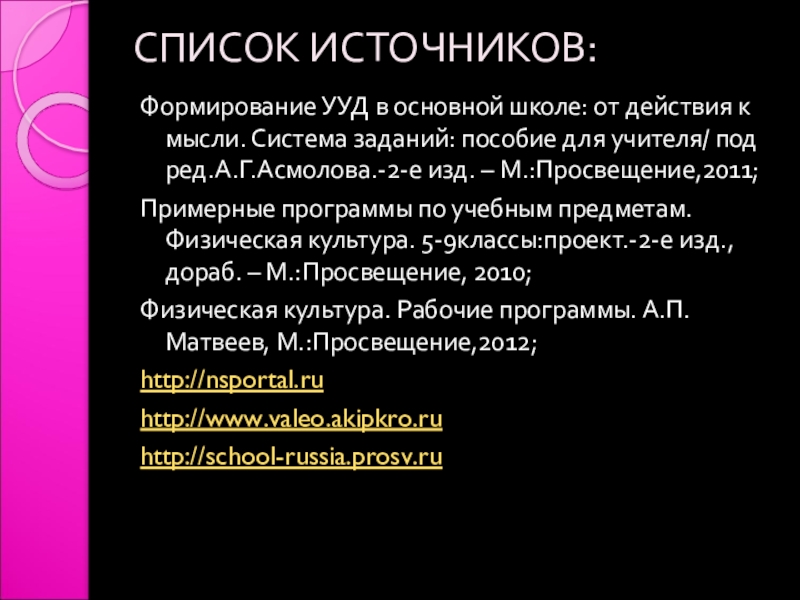 СПИСОК ИСТОЧНИКОВ:Формирование УУД в основной школе: от действия к мысли. Система заданий: пособие для учителя/ под ред.А.Г.Асмолова.-2-е