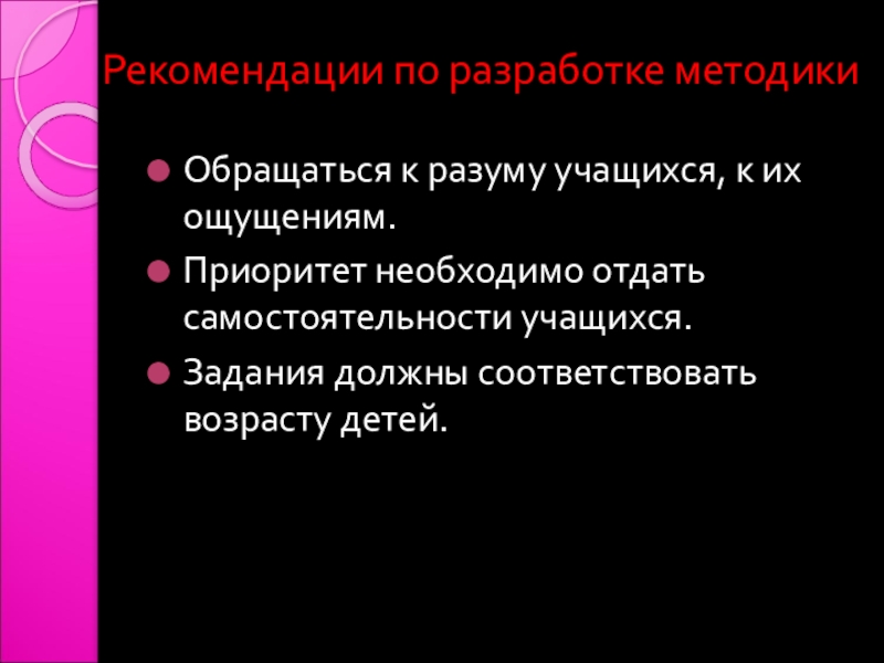 Рекомендации по разработке методикиОбращаться к разуму учащихся, к их ощущениям. Приоритет необходимо отдать самостоятельности учащихся.Задания должны соответствовать