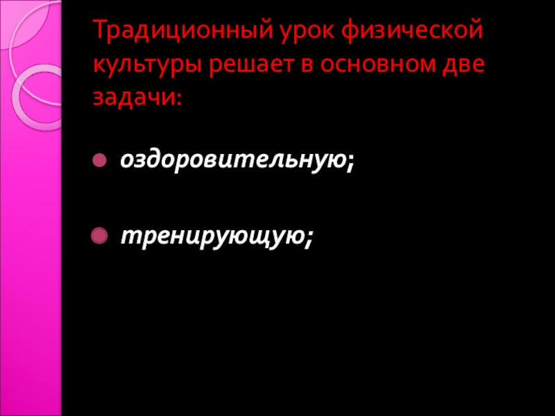 Традиционный урок физической культуры решает в основном две задачи: оздоровительную; тренирующую;