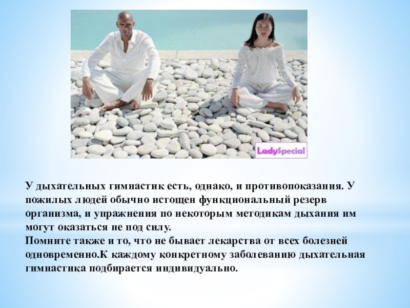 Слайд 11У дыхательных гимнастик есть, однако, и противопоказания. У пожилых людей обычно