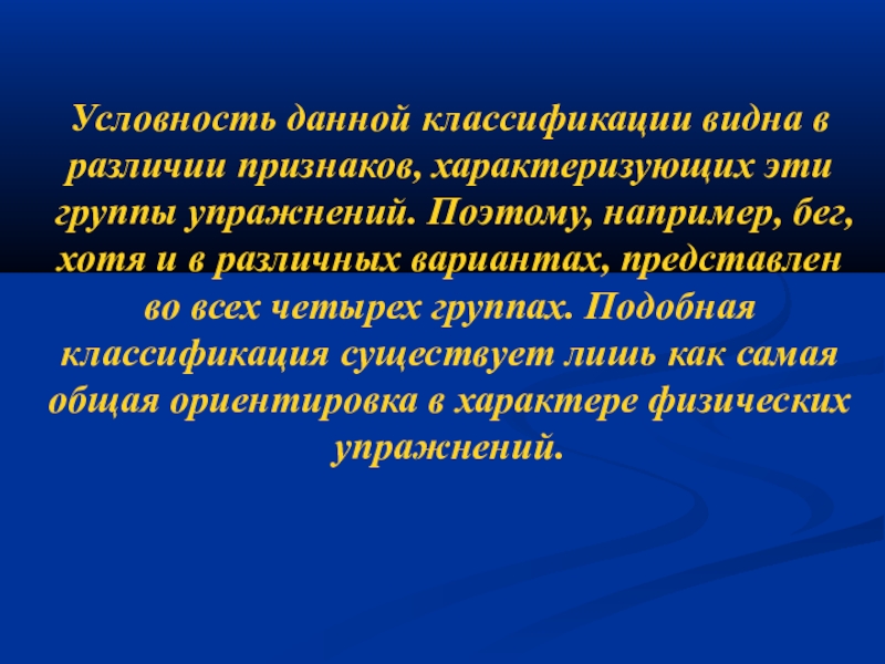 Слайд 10Условность данной классификации видна в различии признаков, характеризующих эти группы упражнений.