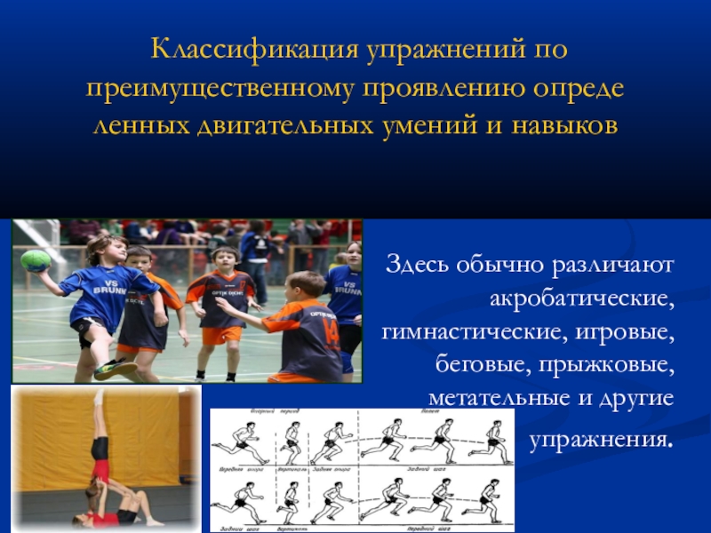 Слайд 17 Классификация упражнений по преимущественному проявлению определенных двигательных умений и навыков