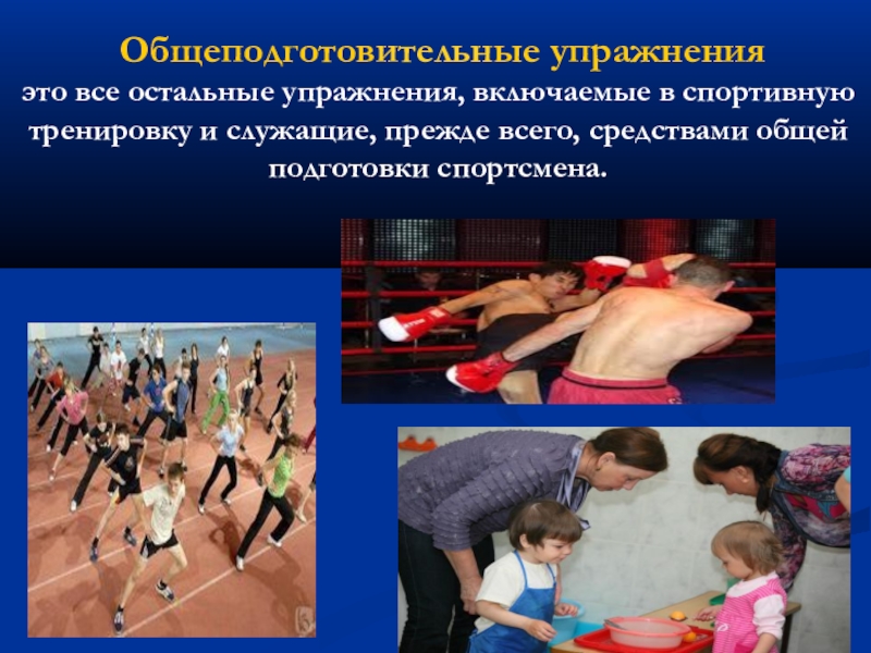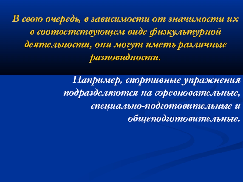 Например, спортивные упражнения подразделяются на соревновательные, специально-подготовительные и общеподготовительные.