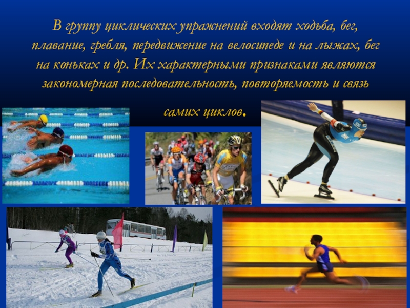 велосипеде и на лыжах, бег на коньках и др. Их характерными признаками являются закономерная последовательность, повторяемость и связь самих циклов.