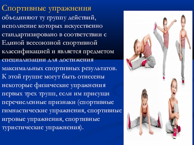 с Единой всесоюзной спортивной классификацией и является предметом специализации для достижения максимальных спортивных результатов. К этой группе могут быть отнесены некоторые физические упражнения первых трех трупп, если им присущи перечисленные признаки (спортивные гимнастические упражнения, спортивные игровые упражнения, спортивные туристические упражнения).