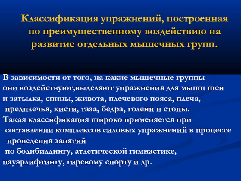 Слайд 22Классификация упражнений, построенная по преимущественному воздействию на развитие отдельных мышечных групп.