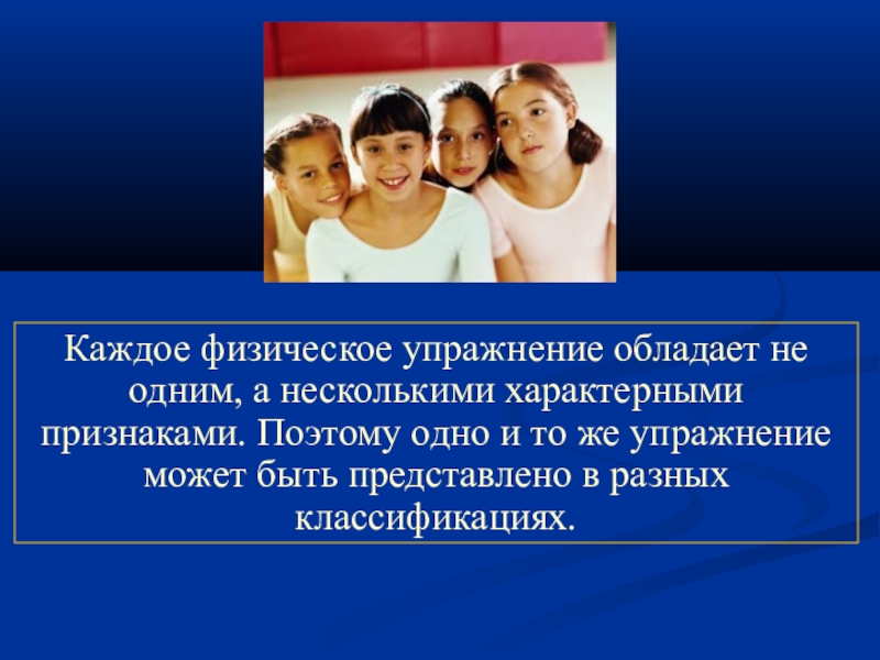 Слайд 3Каждое физическое упражнение обладает не одним, а несколькими характерными признаками. Поэтому