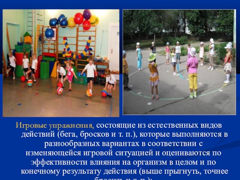 Слайд 7Игровые упражнения, состоящие из естественных видов действий (бега, бросков и т.