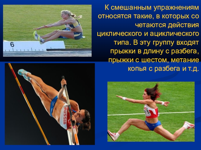 К смешанным упражнениям относятся такие, в которых сочетаются действия циклического и