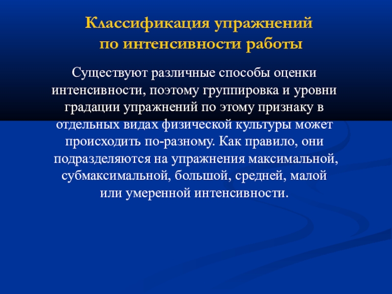 и уровни градации упражнений по этому признаку в отдельных видах физической культуры может происходить по-разному. Как правило, они подразделяются на упражнения максимальной, субмаксимальной, большой, средней, малой или умеренной интенсивности.