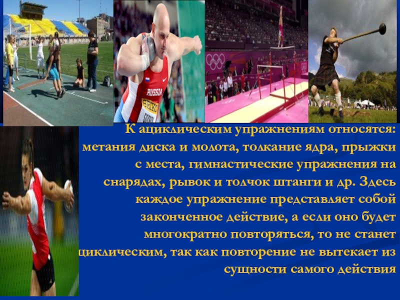 Слайд 20 К ациклическим упражнениям относятся: метания диска и молота, толкание ядра,