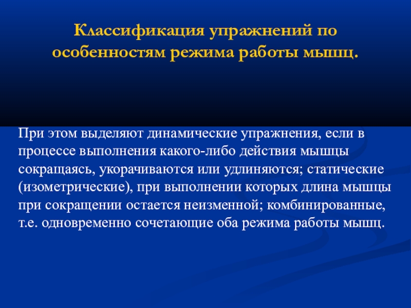 Слайд 23Классификация упражнений по особенностям режима работы мышц.