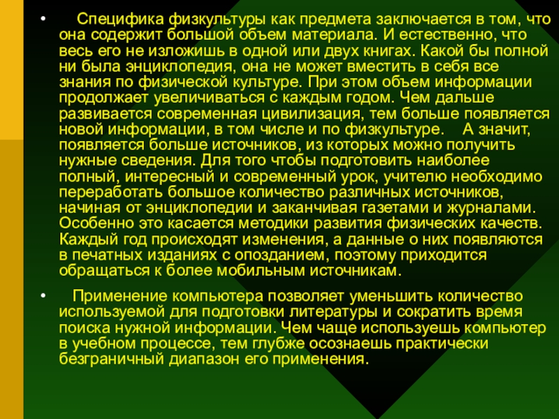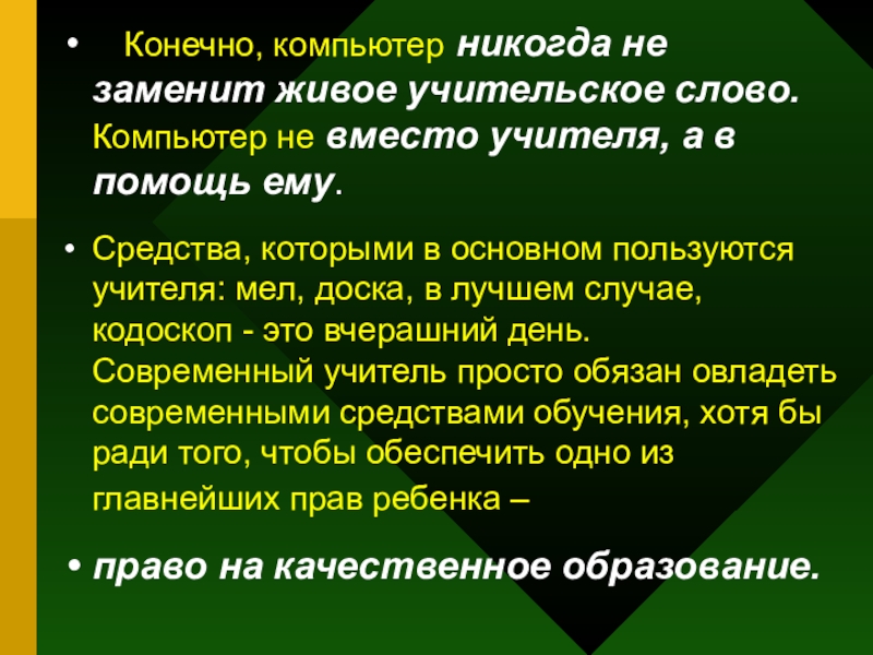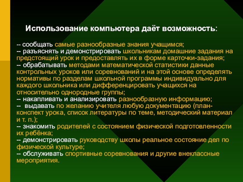 Наглядность, эмоциональность, эстетика - вот ключевые слова для электронных документов. Компьютерные слайды, тесты, контрольные работы с легкостью изменяются, улучшаются и дополняются.