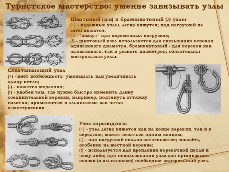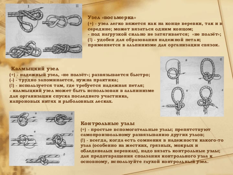 (+) - простые вспомогательные узлы; препятствуют самопроизвольному развязыванию других узлов;