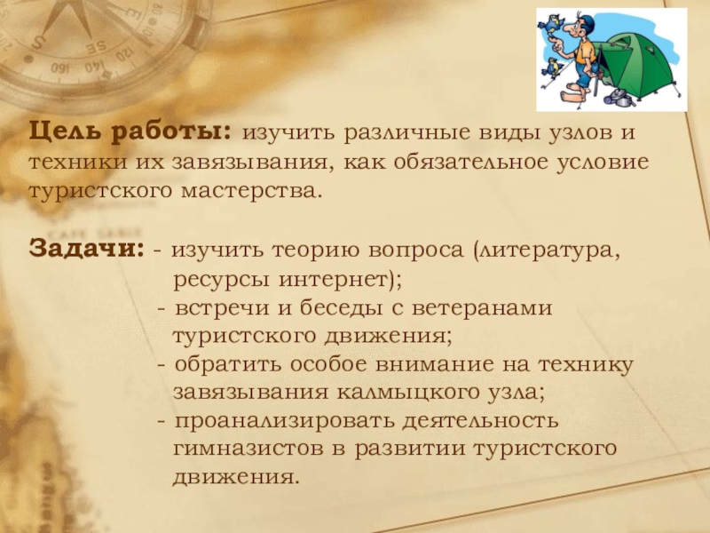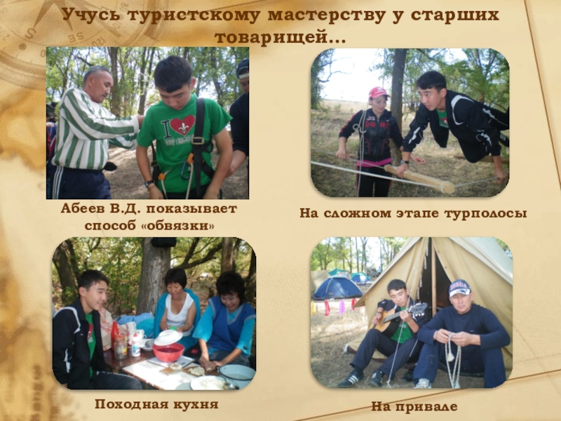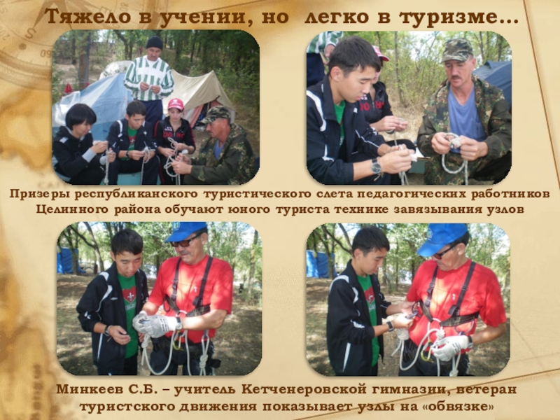 Минкеев С.Б. – учитель Кетченеровской гимназии, ветеран туристского движения показывает узлы на «обвязке»