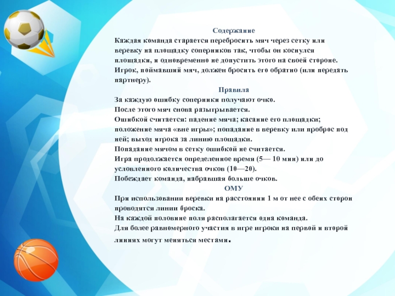 Инвентарь: 1 мяч, волейбольная сетка или веревка.
