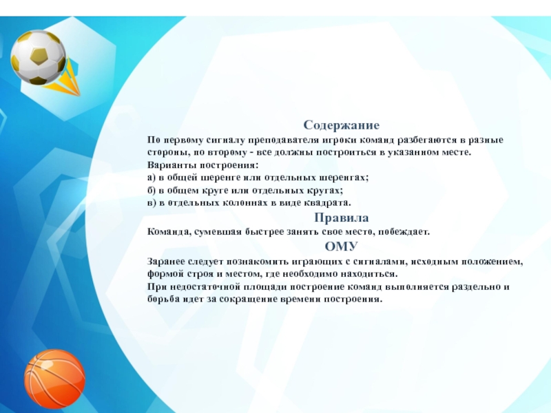 Заранее следует познакомить играющих с сигналами, исходным положением, формой строя и местом, где необходимо находиться.