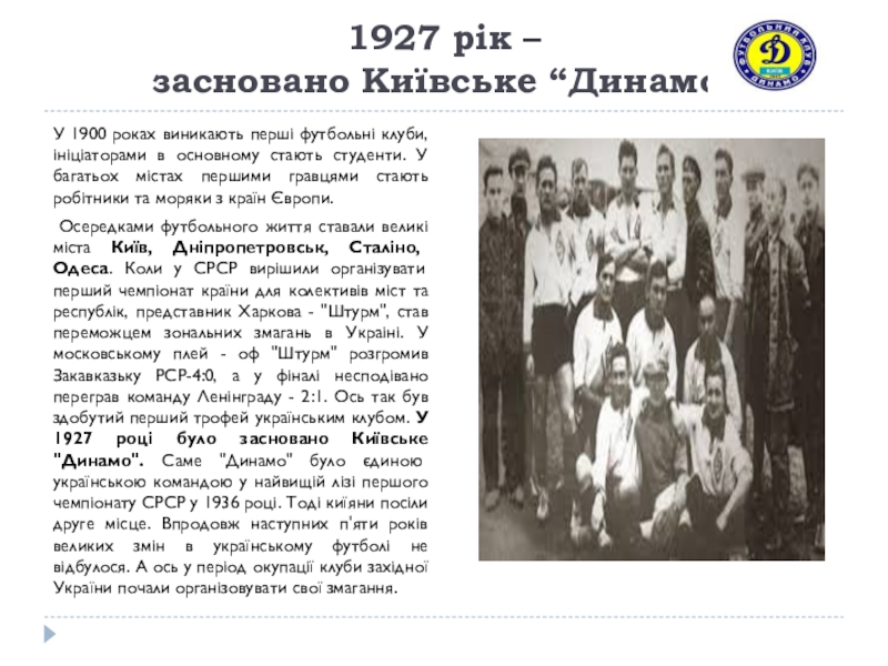Осередками футбольного життя ставали великі міста Київ, Дніпропетровськ, Сталіно, Одеса. Коли у СРСР вирішили організувати перший чемпіонат країни для колективів міст та республік, представник Харкова - "Штурм", став переможцем зональних змагань в Украіні. У московському плей - оф "Штурм" розгромив Закавказьку РСР-4:0, а у фіналі несподівано переграв команду Ленінграду - 2:1. Ось так був здобутий перший трофей українським клубом. У 1927 році було засновано Київське "Динамо". Саме "Динамо" було єдиною українською командою у найвищій лізі першого чемпіонату СРСР у 1936 році. Тоді киїяни посіли друге місце. Впродовж наступних п'яти років великих змін в українському футболі не відбулося. А ось у період окупації клуби західної України почали організовувати свої змагання.