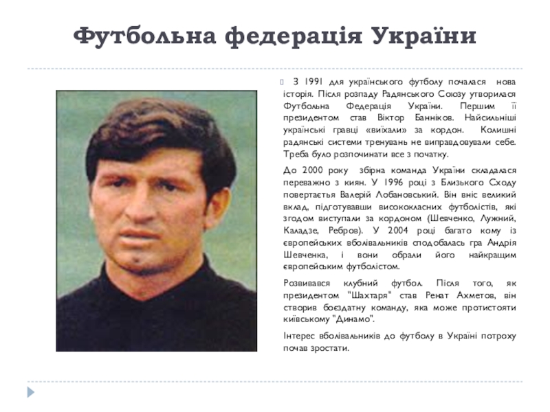 Після розпаду Радянського Союзу утворилася Футбольна Федерація України. Першим її президентом став Віктор Банніков. Найсильніші українські гравці «виїхали» за кордон. Колишні радянські системи тренувань не виправдовували себе. Треба було розпочинати все з початку.