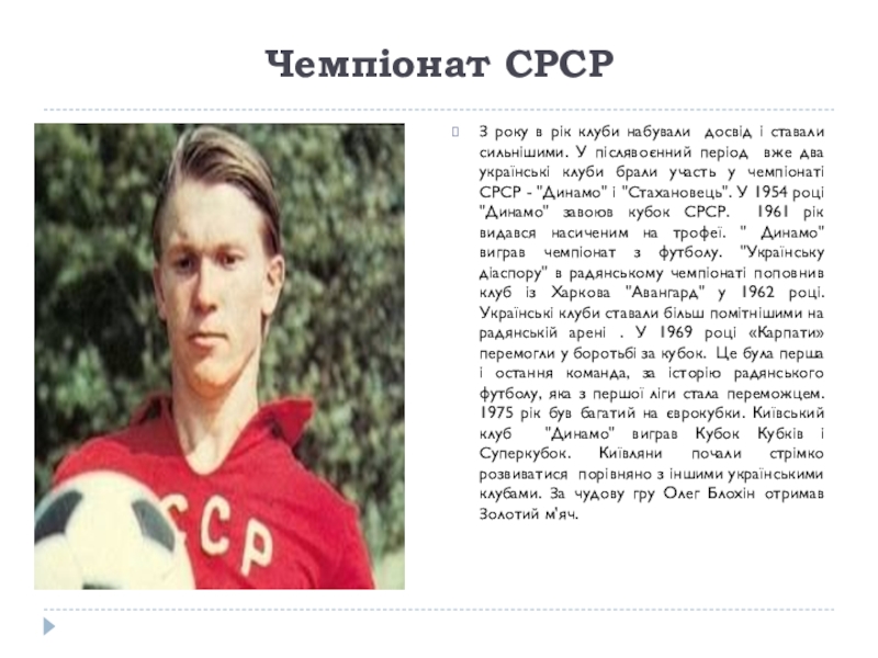 У післявоєнний період вже два українські клуби брали участь у чемпіонаті СРСР - "Динамо" і "Стахановець". У 1954 році "Динамо" завоюв кубок СРСР. 1961 рік видався насиченим на трофеї. " Динамо" виграв чемпіонат з футболу. "Українську діаспору" в радянському чемпіонаті поповнив клуб із Харкова "Авангард" у 1962 році. Українські клуби ставали більш помітнішими на радянській арені . У 1969 році «Карпати» перемогли у боротьбі за кубок. Це була перша і остання команда, за історію радянського футболу, яка з першої ліги стала переможцем. 1975 рік був багатий на єврокубки. Київський клуб "Динамо" виграв Кубок Кубків і Суперкубок. Київляни почали стрімко розвиватися порівняно з іншими українськими клубами. За чудову гру Олег Блохін отримав Золотий м'яч.