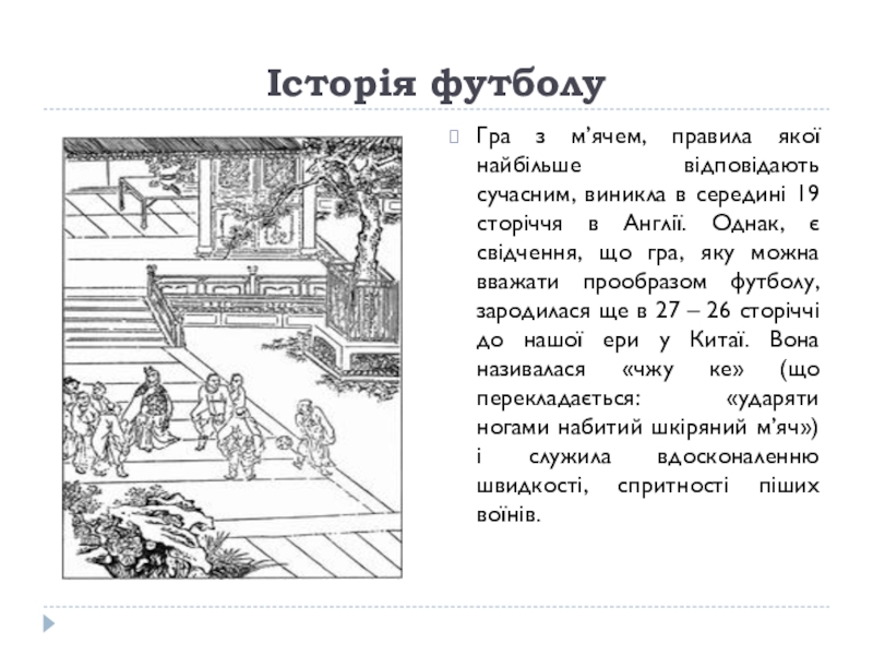середині 19 сторіччя в Англії. Однак, є свідчення, що гра, яку можна вважати прообразом футболу, зародилася ще в 27 – 26 сторіччі до нашої ери у Китаї. Вона називалася «чжу ке» (що перекладається: «ударяти ногами набитий шкіряний м’яч») і служила вдосконаленню швидкості, спритності піших воїнів.