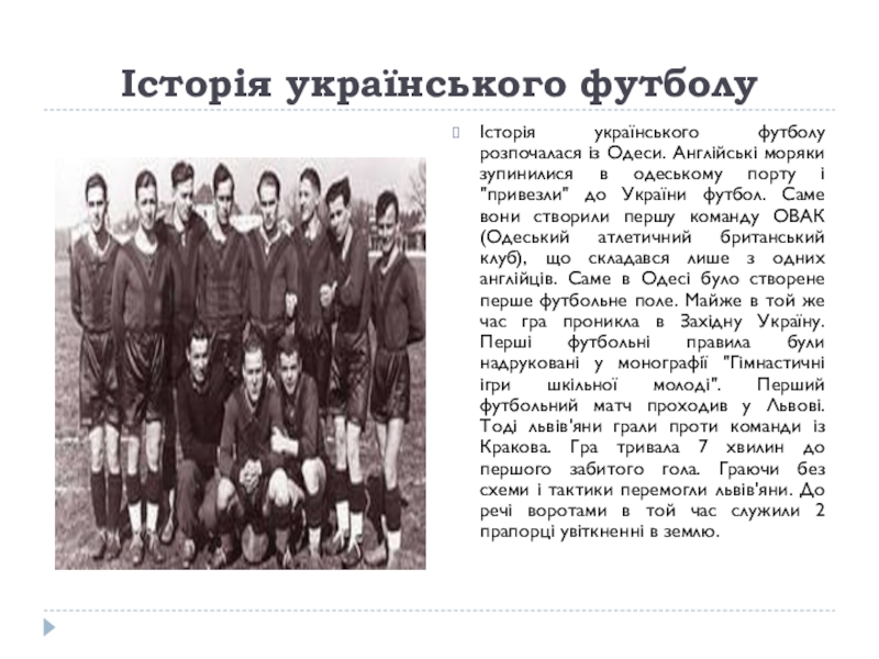 в одеському порту і "привезли" до України футбол. Саме вони створили першу команду ОВАК (Одеський атлетичний британський клуб), що складався лише з одних англійців. Саме в Одесі було створене перше футбольне поле. Майже в той же час гра проникла в Західну Україну. Перші футбольні правила були надруковані у монографії "Гімнастичні ігри шкільної молоді". Перший футбольний матч проходив у Львові. Тоді львів'яни грали проти команди із Кракова. Гра тривала 7 хвилин до першого забитого гола. Граючи без схеми і тактики перемогли львів'яни. До речі воротами в той час служили 2 прапорці увіткненні в землю.