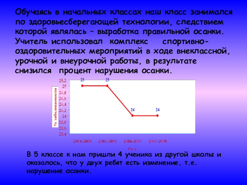 Слайд 16Обучаясь в начальных классах наш класс занимался по здоровьесберегающей технологии, следствием