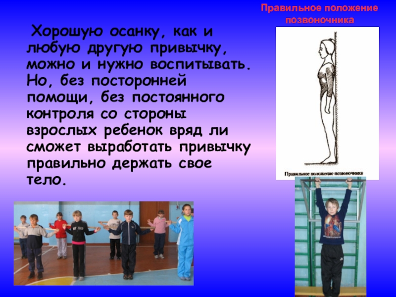 Но, без посторонней помощи, без постоянного контроля со стороны взрослых ребенок вряд ли сможет выработать привычку правильно держать свое тело.