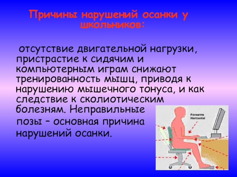 компьютерным играм снижают тренированность мышц, приводя к нарушению мышечного тонуса, и как следствие к сколиотическим болезням. Неправильные