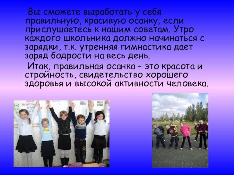 нашим советам. Утро каждого школьника должно начинаться с зарядки, т.к. утренняя гимнастика дает заряд бодрости на весь день.
