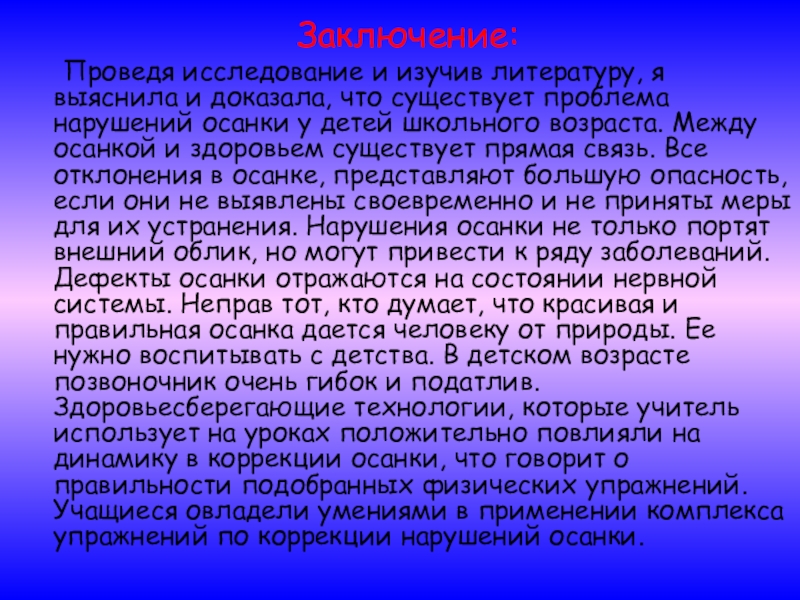 существует проблема нарушений осанки у детей школьного возраста. Между осанкой и здоровьем существует прямая связь. Все отклонения в осанке, представляют большую опасность, если они не выявлены своевременно и не приняты меры для их устранения. Нарушения осанки не только портят внешний облик, но могут привести к ряду заболеваний. Дефекты осанки отражаются на состоянии нервной системы. Неправ тот, кто думает, что красивая и правильная осанка дается человеку от природы. Ее нужно воспитывать с детства. В детском возрасте позвоночник очень гибок и податлив. Здоровьесберегающие технологии, которые учитель использует на уроках положительно повлияли на динамику в коррекции осанки, что говорит о правильности подобранных физических упражнений. Учащиеся овладели умениями в применении комплекса упражнений по коррекции нарушений осанки.
