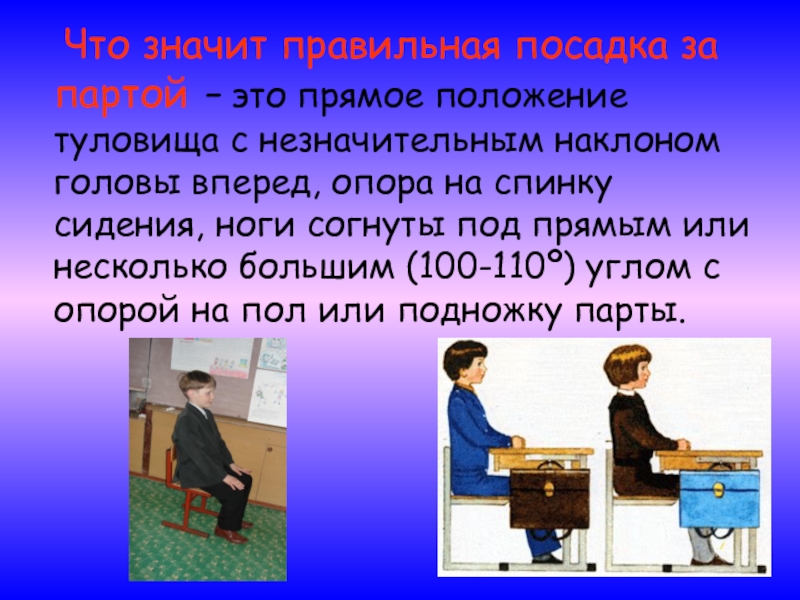 с незначительным наклоном головы вперед, опора на спинку сидения, ноги согнуты под прямым или несколько большим (100-110º) углом с опорой на пол или подножку парты.