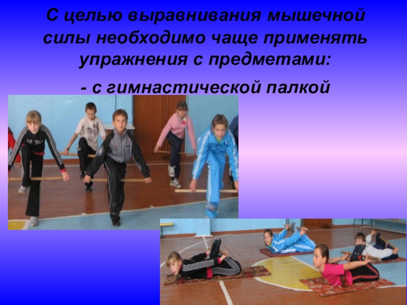 Слайд 21С целью выравнивания мышечной силы необходимо чаще применять упражнения с предметами: