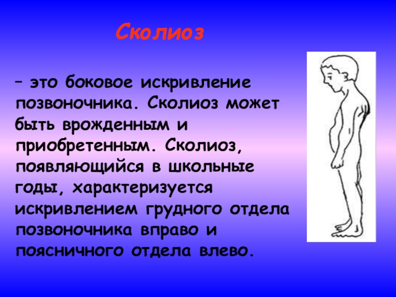и приобретенным. Сколиоз, появляющийся в школьные годы, характеризуется искривлением грудного отдела позвоночника вправо и поясничного отдела влево.