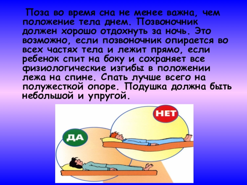 Слайд 13 Поза во время сна не менее важна, чем положение тела днем.
